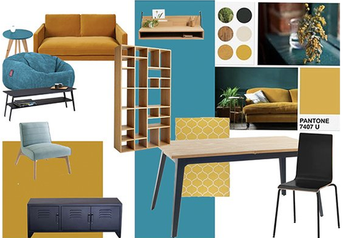 Propositions de planches d'ambiance, gammes de coloris, croquis projetés et shopping-list,
